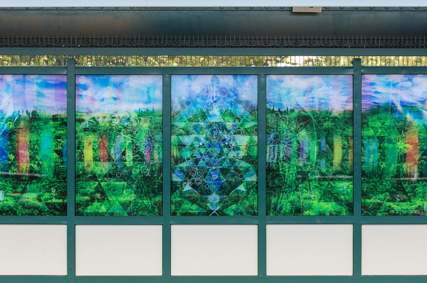 Across the platform, the installation moves from microcosm to macrocosm. Mirrored panel sets reference the geometries of cells and molecular structures on one side and the expansive forms of galaxies and cosmic networks on the other. Between these poles, four additional panel sets explore the “in-between,” centering Woodhaven and its landscape.