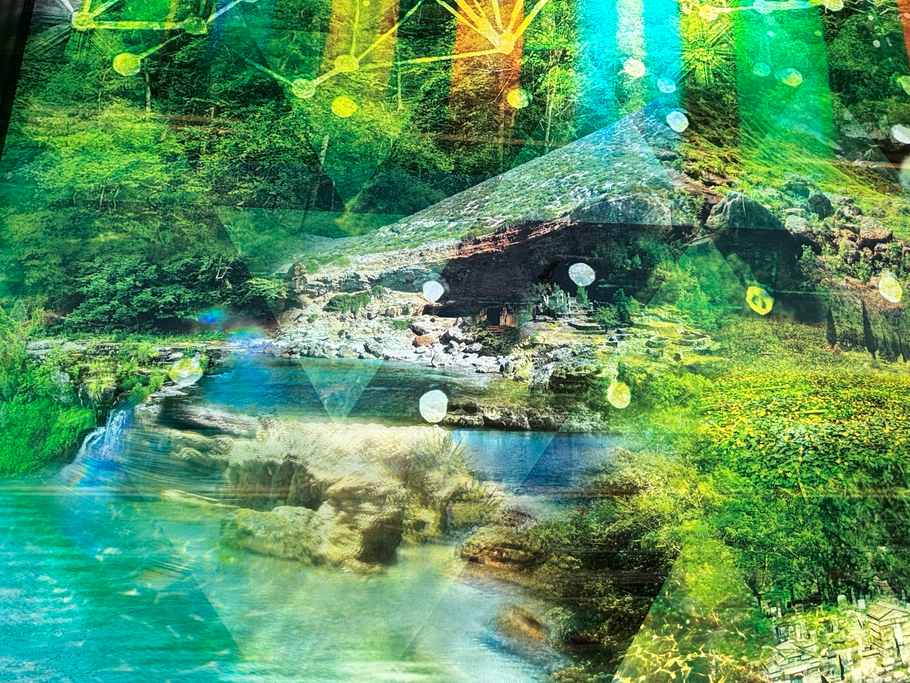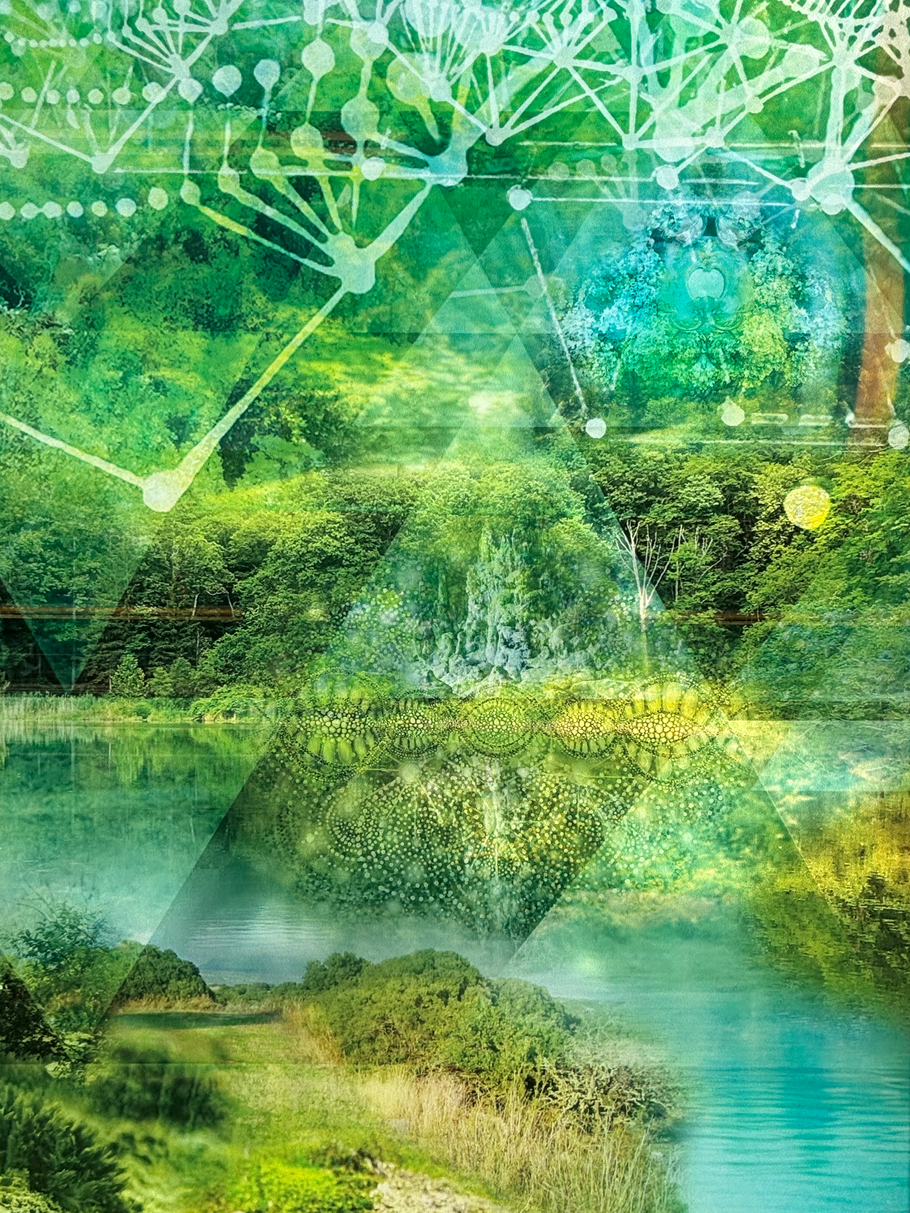 Across the platform, the installation moves from microcosm to macrocosm. Mirrored panel sets reference the geometries of cells and molecular structures on one side and the expansive forms of galaxies and cosmic networks on the other. Between these poles, four additional panel sets explore the “in-between,” centering Woodhaven and its landscape.